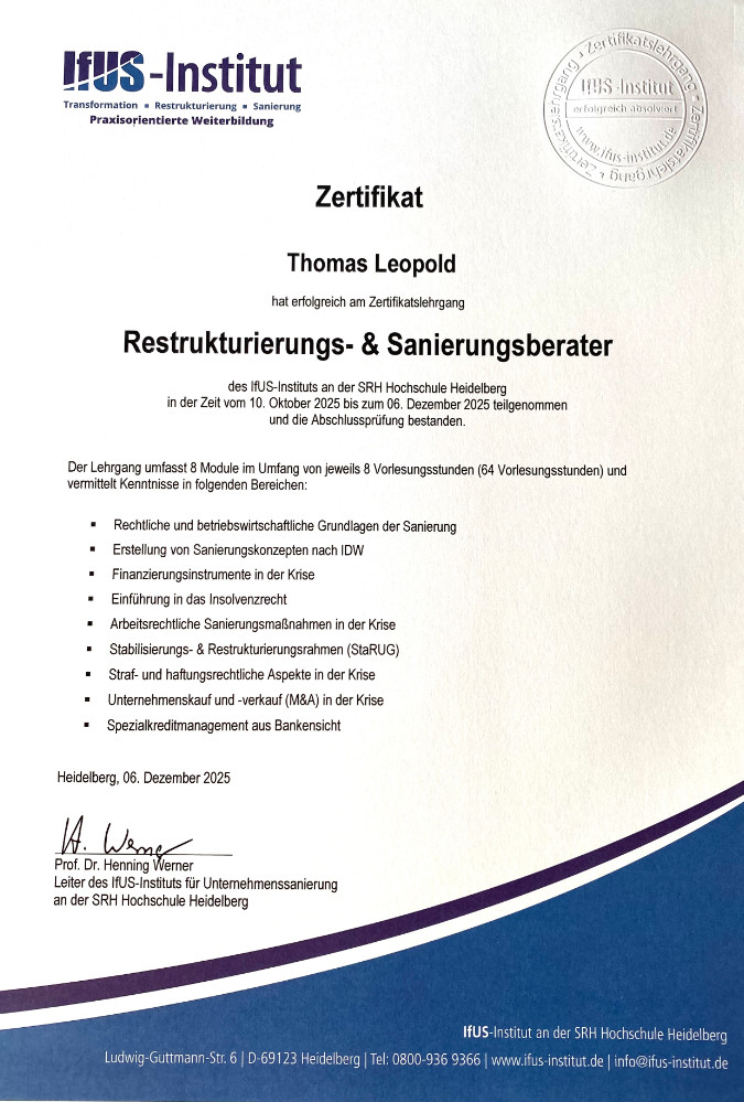 Ich erstelle diese Sanierungskonzepte unter Einhaltung des IDW Standards sowie der aktuellen BGH-Rechtsprechung.